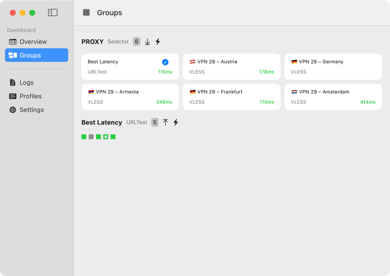 Программа автоматически выбирает сервер с наименьшей задержкой. Если вам нужен какой-то конкретный, вы можете выбрать его в разделе Groups, развернув первую секцию (кнопка со стрелкой вверх или вниз).